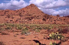 : bouilloire, café soluble, thé, sucre, tasse. Il fait encore nuit lorsque nous repartons vers 6h30. Le temps semble un peu plus clément mais il fait un peu plus froid. Nous arrivons au premier site : Knersvlakte à 14 km au nord de Vanrhynsdorp. Beaucoup de nouveautés : les Caille des blés (Common Quail) chantent partout, nous en verrons même deux ; Alouette moineau à dos gris (Grey-backed Sparrow-Lark), le premier Autour chanteur pâle (Pale Chanting-Goshawk), Traquet toromilli (Capped Wheatear), Oie de Gambie (Spur-winged Goose) Nous reprenons la route vers Kamieskroon avec à nouveau un peu de pluie. Une halte ravitaillement dans ce petit village se termine en arrêt ornithologique, les alentours du village étant très intéressants :, Traquet familier (Familiar Chat), Serin à gorge blanche (White-throated Canary), Huppe d'Afrique (African Hoopoe), Mésange des acacias (Ashy Tit) Nous empruntons la piste en direction de Gamoep par Kamies Loop et Aardvark Kloof (p102 & 103). A tout point de vue c'est un site à ne pas rater. Les paysages sont grandioses et nous avons eu en plus la chance d'avoir des fleurs partout. Quelques observations en vrac : Pie-Grièche bacbakiri (Bokmakierie), Aigle de Verreaux (Verreaux's Eagle), Spatule d'Afrique (African Spoonbill), Traquet kaloti (Mountain Wheatear), Erismature macao (Maccoa Duck), Martinet caffre (White-rumped Swift), Alouette du Karoo (Karoo Lark) En fin d'après midi nous arrivons à Gemoep et il nous reste encore plus de 60 kilomètres jusqu'à Diepvlei, ferme auberge où nous avons réservé (adresse communiquée par Claire). Le coucher de soleil est accompagné plusieurs fois de l'envol de l'Outarde de Ludwig (Ludwig's Bustard) et de l'Outarde à miroir blanc (Southern black Korhaan). Nous arrivons finalement à la tombée de la nuit. Un bon repas chaud nous attend. Nous terminons la journée par une petite sortie nocturne en 4x4 avec le propriétaire dans la steppe attenant à la ferme. Nous ne verrons pas grand chose, sans doute à cause du froid et de l'heure trop précoce (vers 21h30) : 2 lièvres sp (Hare sp), un lièvre sauteur (Springhare) et quelques moutons |
