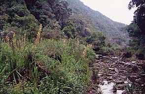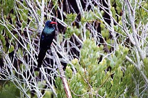 Canary). A l'entrée du sentier, nous repèrons une sauterelle de belle taille ; nous en verrons plusieurs dizaines par la suite le long du sentier. Très vite une montée assez raide se présente et nous ne regrettons de ne pas avoir pris les longues vues qui sont quasiment inutiles vu la densité de la végétation. Sur la balade une seule fois une lunette aurait pu être utile. Le temps couvert se dégage momentanément et nous pouvons observer la forêt sous un rayon de soleil. De plus, les observations intéressantes s'accumulent : dans le même arbre, quatre Etourneaux métallique à ventre noir (Black-bellied Glossy-Starling) et quelques Irisors moqueurs (Green Woodhoopoe) avec leur joli bec rouge. Le dernier de la troupe peu farouche se laisse même photographier avant de rejoindre ses compagnons de l'autre côté de la rivière. Nous faisons des observations régulières de Batis du Cap (Cape Batis) et d'Apalis du Cap (Bar-throated Apalis) et de Souï-Manga du Cap (Southern Double-collared Sunbird). De temps en temps, des petits sentiers rejoignent la rivière, ce qui permet d'avoir des points de vue plus dégagés. Quelques Hirondelles noirâtres (Black Sawwing) volent assez haut. Une Buse de forêt (Forest Buzzard) traverse la vallée. Les arbres en fleurs attirent les Souï-Mangas et en particulier quelques Souï-Manga à double collier (Greater Double-collared Sunbird). Un Martin-pêcheur tout bleu remonte la rivière à tire d'aile. L'observation est trop rapide pour différencier les deux espèces possibles ; on reste donc un peu sur notre faim Quelques minutes plus tard un autre vient se poser bien en vu à quelques mètres : Martin-pêcheur à demi collier (Half-collared Kingfisher), le plus rare ! Nous remontons vers le sentier principal. Juste en face de nous, deux oiseaux se déplacent dans les zones les plus sombres sous des amas de branches, de lianes et de racines. Une trouée tombe à pic et permet d'identifier sans problème deux Bouscarles de Knysna (Knysna Scrub-Warbler), l'une des espèces les plus discrètes d'après les guides ! Les deux passereaux n'ont pas encore disparu qu'un léger tambourinage se fait entendre sur notre gauche. Nous repérons bien vite un Pic olive (Olive Woodpecker) dont les efforts sont récompensés une larve de belle taille toute blanche. Un peu plus loin c'est un superbe mâle de Couroucou narina (Narina Trogon) ! Celui-ci se déplace de branche en branche puis disparaît. Quelques mètres plus loin, nous pensons l'avoir retrouvé mais cette fois c'est une femelle ! Entre temps, j'ai entrevu un Cubla neigeux (Black-backed Puffback), histoire de varier un peu les plaisirs. Progressivement, l'activité des oiseaux diminue et nous avançons un peu plus vite non sans avoir ajouté le Bulbul jaboteur (Terrestrial Brownbul) et quelques Colioux rayés (Speckled Mousebird) à notre liste. La cascade où ce termine le sentier est assez décevante mais nous n'étions pas vraiment venus pour elle à vrai dire. Le retour est plus calme mais permet cependant de faire quelques photos intéressantes. A force de rater de belles occasions, je décide de porter mon appareil photo en bandoulière armé du 300m. Dans les minutes qui suivent cette décision, deux superbes Touracos louries (Knysna Turaco) se posent juste à côté de nous : c'est dans la boîte ! De retour au camping, nous prenons la voiture pour changer un peu de site et pique niquer au bord de l'un des étangs recommandés (p120). Les deux premiers ne semblent pas très intéressants, ce qui n'est pas le cas du troisième : Canard du Cap (Cape Shoveler), Canard à bec jaune (Yellow-billed Duck), Grèbe castagneux (Little Grebe) et Nette brune (Southern Pochard) sont très nombreux. Les Erismatures à dos blanc (White-backed Duck) et les Erismatures maccoa (Maccoa Duck) sont un peu moins nombreuses mais bien visibles. Dans les roseaux, une Spatule d'Afrique (African Spoonbill) se repose au milieu de nombreux Hérons cendrés (Grey Heron). Au bout de quelques minutes, un Busard grenouillard survole la roselière et pendant notre repas, un Héron pourpré (Purple Heron) disparaît dans cette végétation dense. Après le déjeuner, je raccompagne au camping Valérie qui a besoin de se reposer. Je m'arrête à nouveau sur notre lieu de pique-nique et je repère cette fois un Pygargue vocifère (African Fish-Eagle) sur un îlot en plein milieu du lac. Un peu plus loin, je stoppe aux abords d'un observatoire. Des Cisticoles des marais (Tinkling Cisticola) chantent le long du chemin et se laissent observer correctement. L'observatoire est occupé par un couple d'ornithologues locaux. J'ai à peine le temps de les saluer et de poser mon sac à dos qu'une Poule sultane (Purple Swamphen) passe tranquillement juste en dessous de nous ; je n'ai malheureusement pas le temps de sortir mon appareil. Je discute un moment de notre randonnée matinale et ils me confirment le fait que nous avons eu pas mal de chance ! Ils m'indiquent de plus de nouveaux sites à visiter pour les quelques heures qu'il me restent. La visite d'un autre observatoire me permet d'ajouter encore le Cossyphe du Cap (Cape Robin-Chat), la Rousserolle à bec fin (Lesser Swamp-Warbler) et surtout la Bouscarle des marais (African Bush-Warbler). Je termine par une petite route qui mène à l'océan Indien et qui longe une grande zone marécageuse. Pas beaucoup de limicoles pour autant mais tout de même une vingtaine de Flamants roses (Greater Flamingo). De son côté, Valérie après une bonne sieste réparatrice aura l'occasion d'observer un Blongios nain (Little Bittern). Nous terminons à nouveau la journée devant un bon poisson après avoir évité d'écraser sur la route un joli Crapaud (du moins autant qu'un crapaud peut l'être !). |